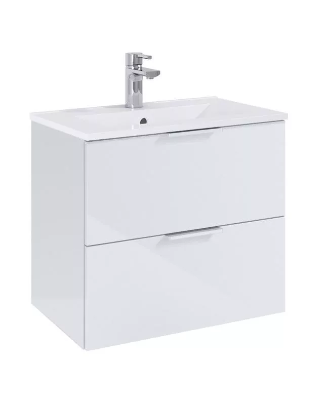 Mosdószekrény és mosdótál szettben.TECHNIKAI LEÍRÁS: összeszerelt termék szín: fényes fehér korpusz és front 16 mmes farostlemez lágy záródású fiókok kerámia mosdó fehér alumínium fogantyú 2 db állítható fém fali akasztó, összesen 90 kg teherbírással