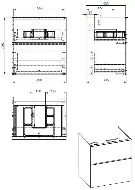 Alsó szekrény, AREZZO design MONTEREY 60 cm-es alsószekrény 2 fiókkal Matt Szürke színben, szifon