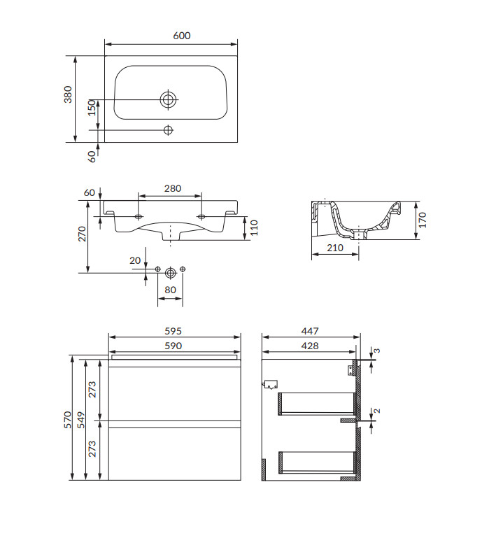 A készlet tartalmaz egy MODUO mosdószekrényt lapra szerelve, MODUO 60 mosdókagylót.