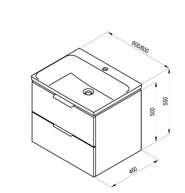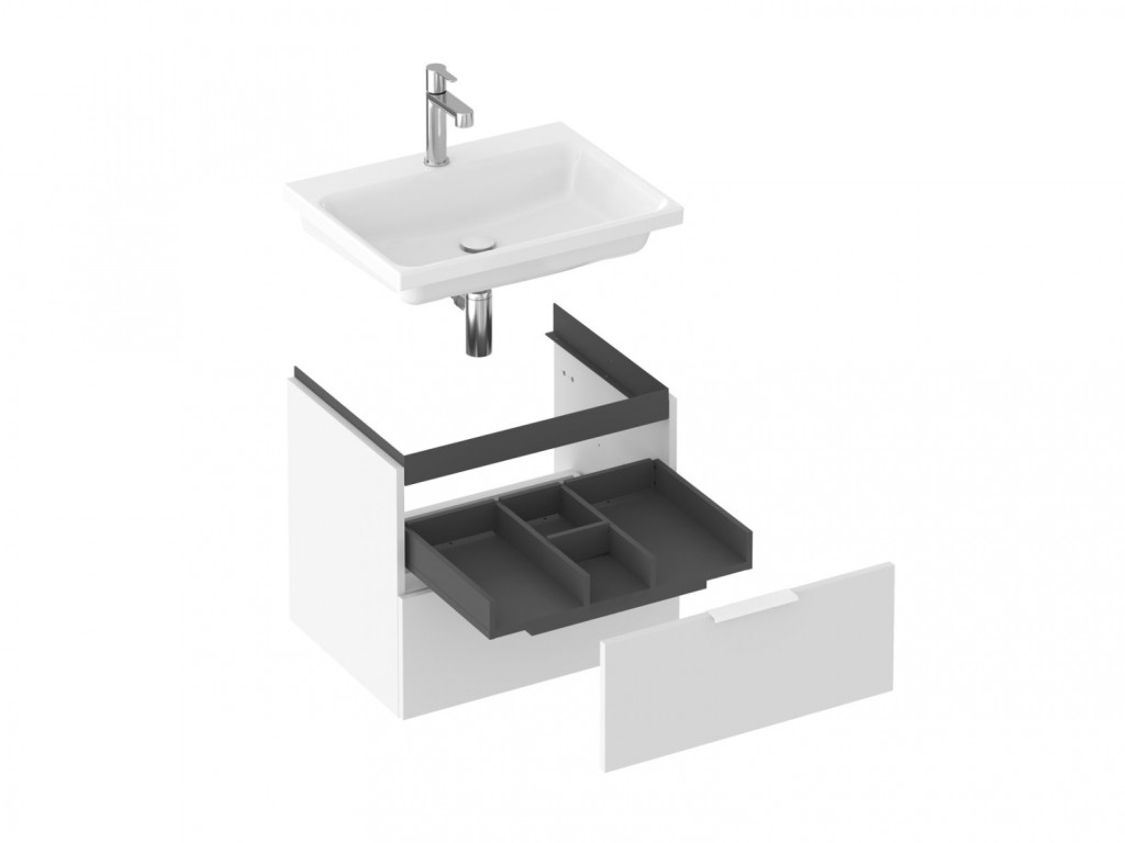 A szekrény a Comfort 60 aláépíthető mosdóhoz van tervezve túlfolyó nélkül, fix kifolyóval ellátott mosdó szifonnal kiegészítve.
