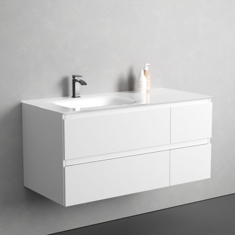 Alsó szekrény, Sanotechnik Cube 100 függesztett bútorszett, üvegmosdóval, fehér 08334