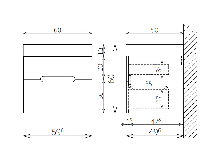 Vasalatok: tandembox, teljes kihúzású, csillapított záródású önbehúzó vasalatok (Terhelhetőség: 30 kg)