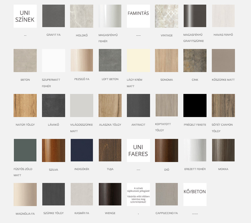 Színválaszték: magasfényű fehér, szupermatt fehér, lágy krém matt, matt kasmír, kőszürke matt, antracit, matt fekete, matt nádzöld, füstös zöld matt, matt indigókék, sonoma, natúr tölgy, dohány tölgy, tuja, loft beton, grafit fa, szilva, mokka