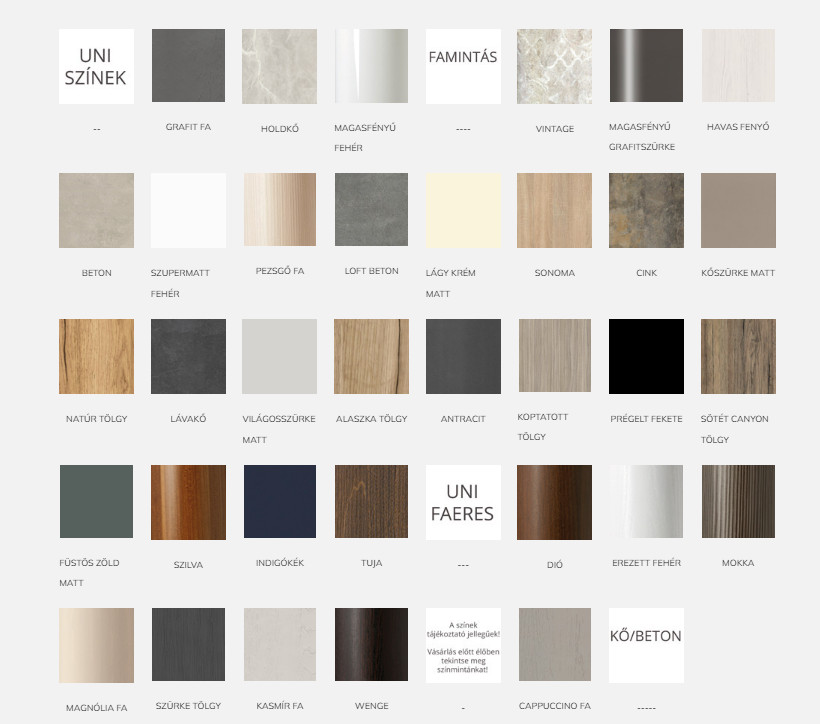 Színválaszték: magasfényű fehér, szupermatt fehér, lágy krém matt, matt kasmír, kőszürke matt, antracit, matt fekete, matt nádzöld, füstös zöld matt, matt indigókék, sonoma, natúr tölgy, dohány tölgy, tuja, loft beton, grafit fa, szilva, mokka