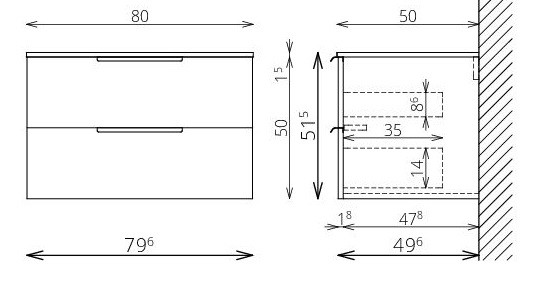 Vasalatok: tandembox, teljes kihúzású, csillapított záródású önbehúzó vasalatok (Terhelhetőség: 30 kg)