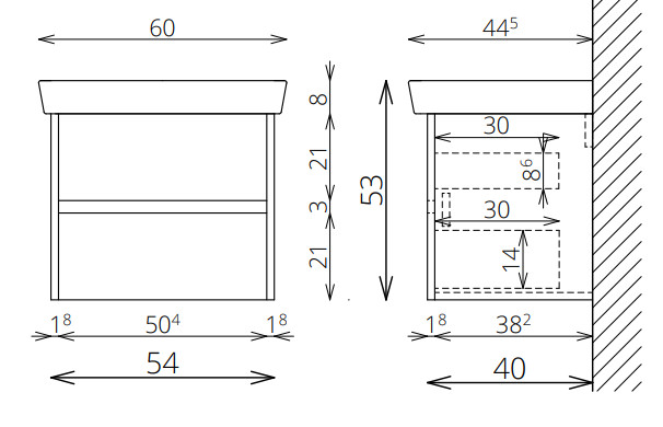 Vasalatok: teljes kihúzású, csillapított záródású önbehúzó vasalatok (Terhelhetőség: 30 kg)