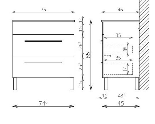 Vasalatok: teljes kihúzású, csillapított záródású önbehúzó vasalatok (Terhelhetőség: 30 kg)
