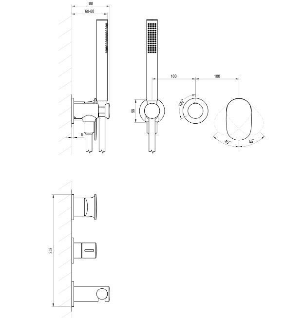 A beépített csaptelep zuhanykészlettel (tömlő és kézizuhany) saját telepítési testtel rendelkezik, nem alkalmas R-boxhoz.