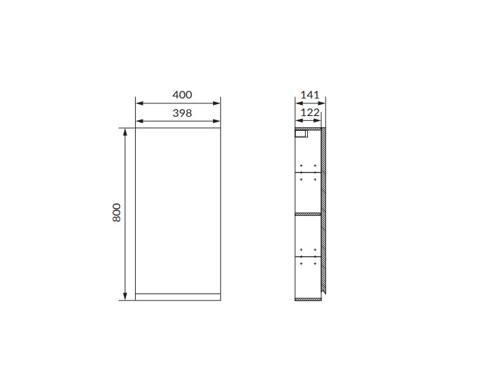 A szekrény belsejében 3 polc található: egy bútorpolc (fix) és két edzett üvegből készült üvegpolc.