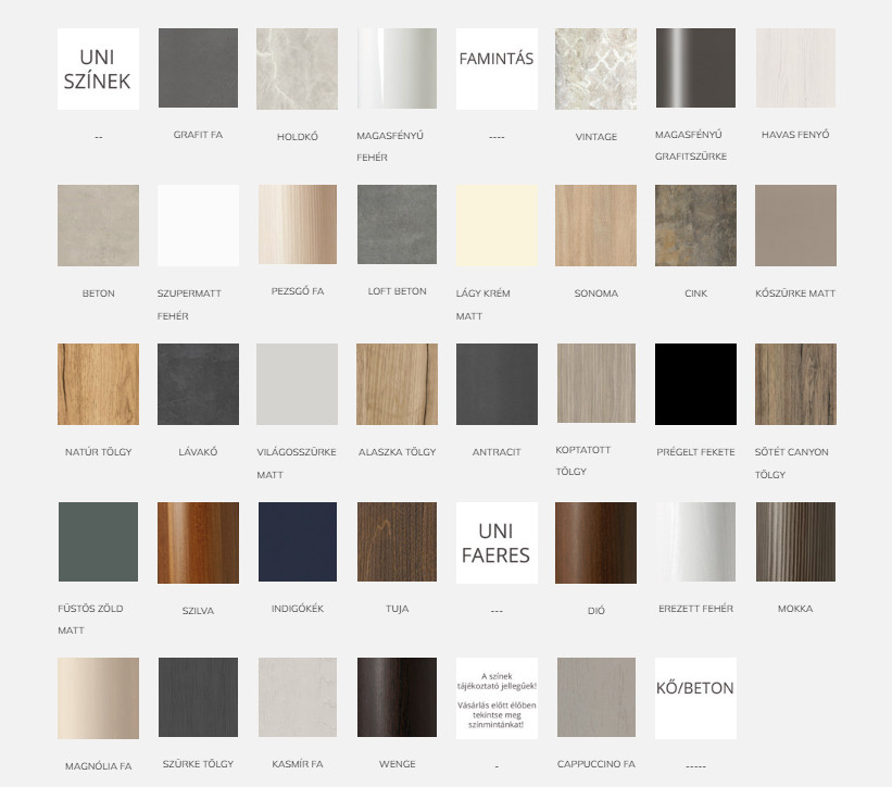 Színválaszték: magasfényű fehér, szupermatt fehér, lágy krém matt, matt kasmír, kőszürke matt, antracit, matt fekete, matt nádzöld, füstös zöld matt, matt indigókék, sonoma, natúr tölgy, dohány tölgy, tuja, loft beton, grafit fa, szilva, mokka