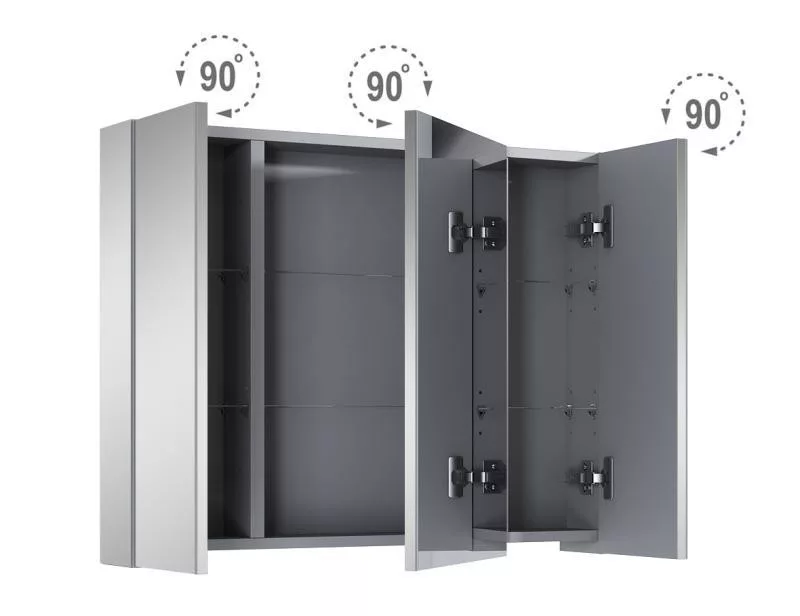 Kiváló minődségben készült, modern, sokoldalú fali szekrény tükrös ajtóval, tükrös oldalakkal, softclose záródással és állítható magasságú üvegpolcokkal felszerelve.