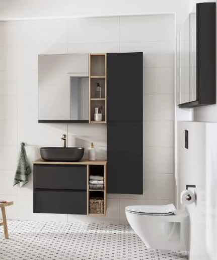 Mélysége a fali szekrényekhez és egy nyitott modulhoz igazodik ebből a kollekcióból.