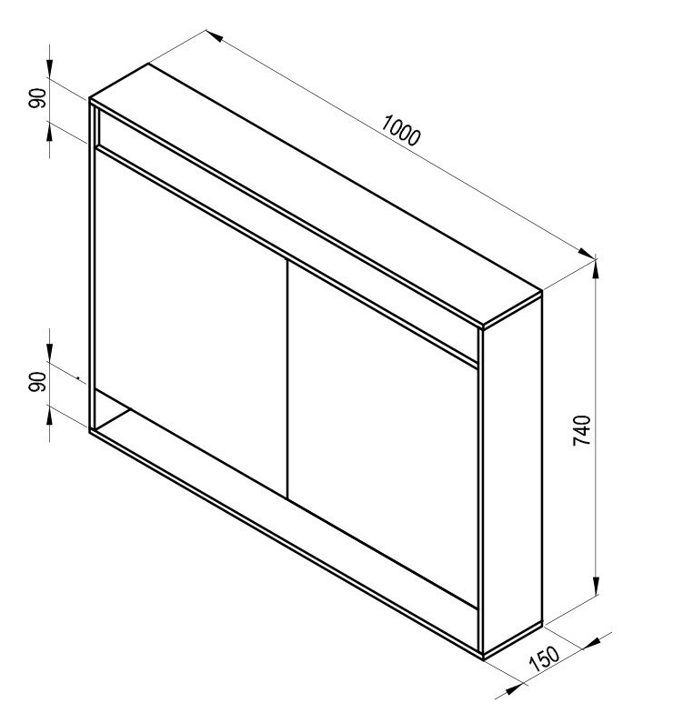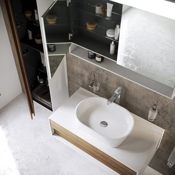 Tükrös kinyitható szekrény, felső részében LED világítással. A szekrény ajtaján tükör található, a külső és belső oldalon is. A szekrény az alsó részében egy praktikus polccal szolgál, belül két üvegpolc található.