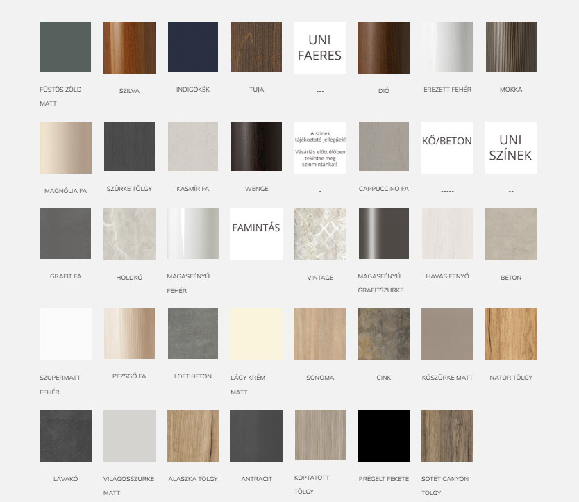Színválaszték: magasfényű fehér, szupermatt fehér, lágy krém matt, matt kasmír, kőszürke matt, antracit, matt fekete, matt nádzöld, füstös zöld matt, matt indigókék, sonoma, natúr tölgy, dohány tölgy, tuja, loft beton, grafit fa, szilva, mokka