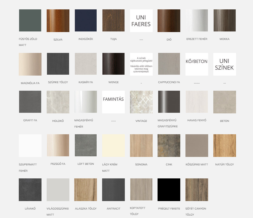 Színválaszték: magasfényű fehér, szupermatt fehér, lágy krém matt, matt kasmír, kőszürke matt, antracit, matt fekete, matt nádzöld, füstös zöld matt, matt indigókék, sonoma, natúr tölgy, dohány tölgy, tuja, loft beton, grafit fa, szilva, mokka