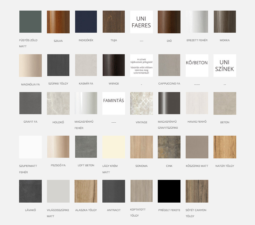 Színválaszték: magasfényű fehér, szupermatt fehér, lágy krém matt, matt kasmír, kőszürke matt, antracit, matt fekete, matt nádzöld, füstös zöld matt, matt indigókék, sonoma, natúr tölgy, dohány tölgy, tuja, loft beton, grafit fa, szilva, mokka