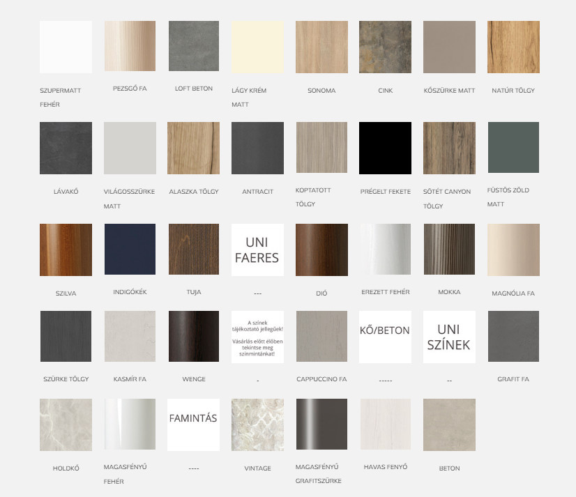 Színválaszték: magasfényű fehér, szupermatt fehér, lágy krém matt, matt kasmír, kőszürke matt, antracit, matt fekete, matt nádzöld, füstös zöld matt, matt indigókék, sonoma, natúr tölgy, dohány tölgy, tuja, loft beton, grafit fa, szilva, mokka