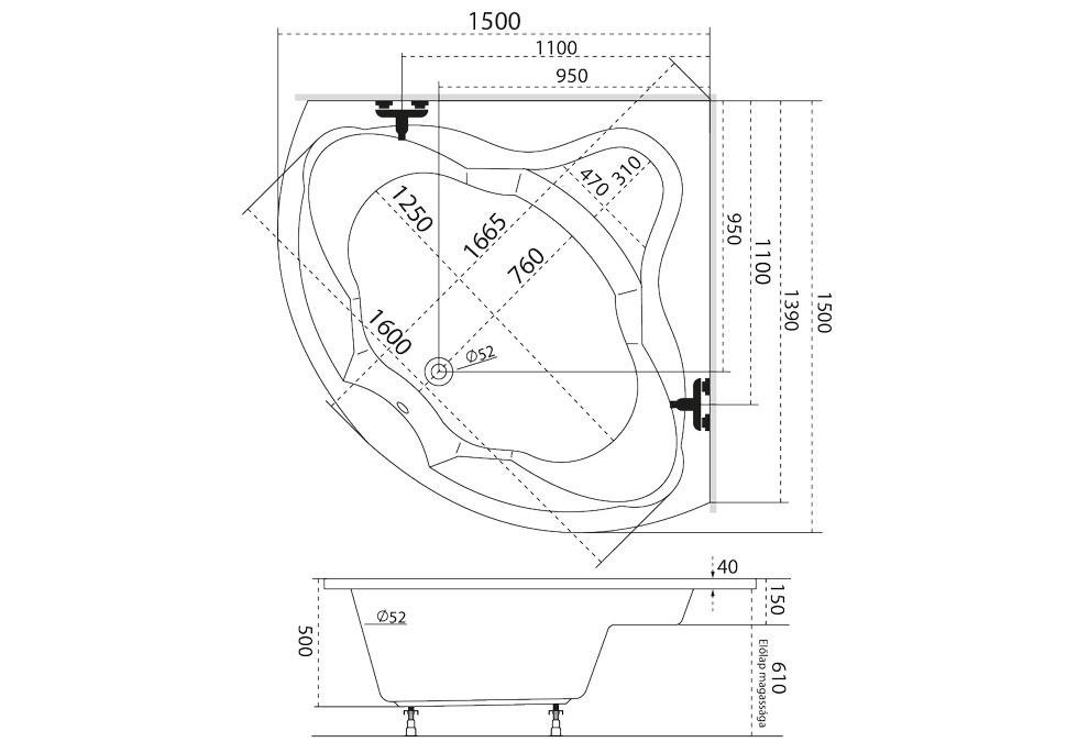Integrált vezérlőpanel digitális kijelzővel a kádtest peremén : Esztétikus megjelenésű, puha nyomógombsorral, digitális kijelzővel és visszajelző LED-ekkel kialakítva, amelyen nyomon követhető és vezérelhető a masszázskád számos szolgáltatása és funkciója.