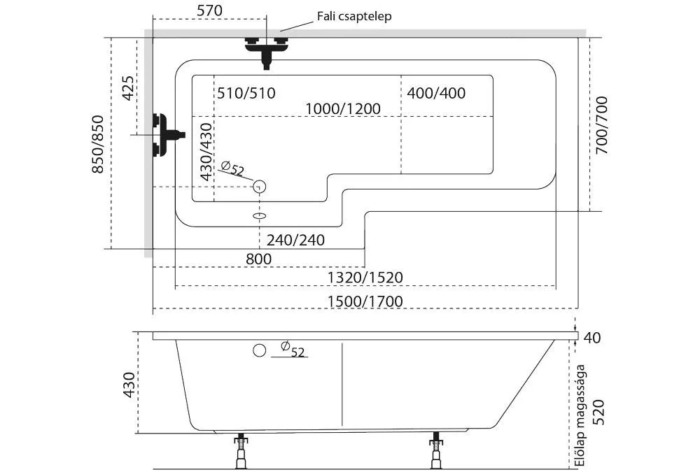 Hidromasszázs kád, M-Acryl Linea 150x70/85 Wellness 22 fúvókás elektronikus