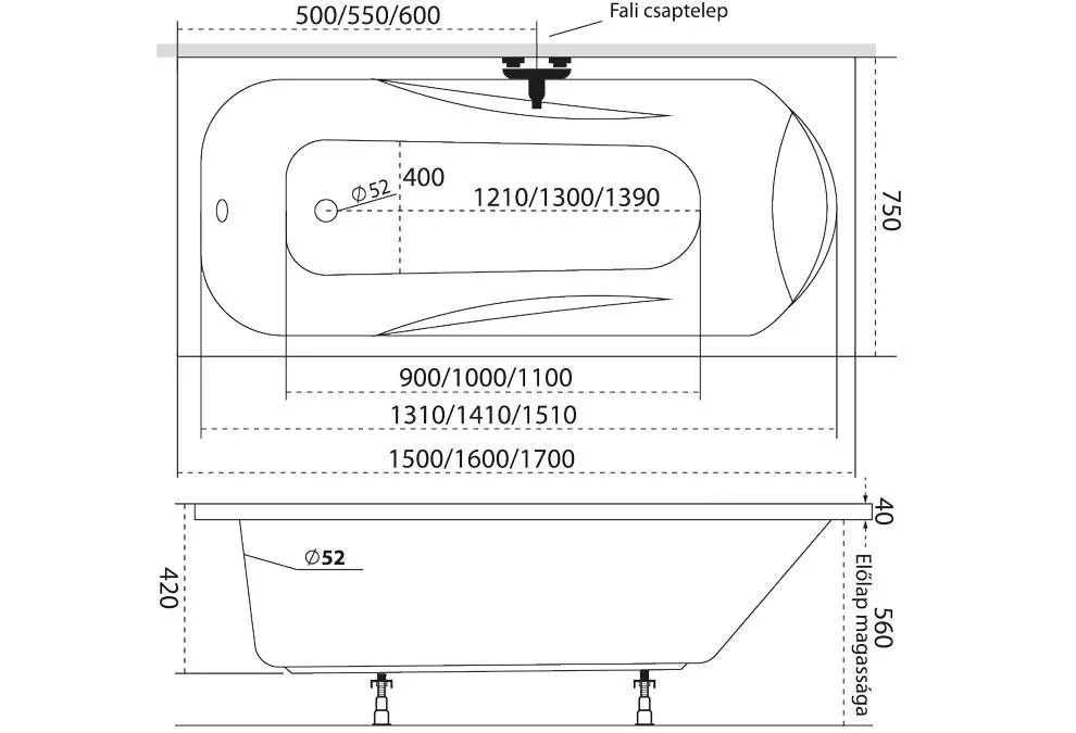 Széles belső kialakítású kád, tágas fekvő felülettel.