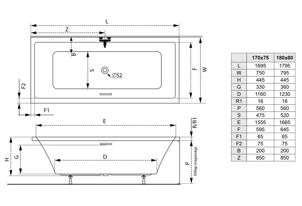Kád mérete: 180 cm