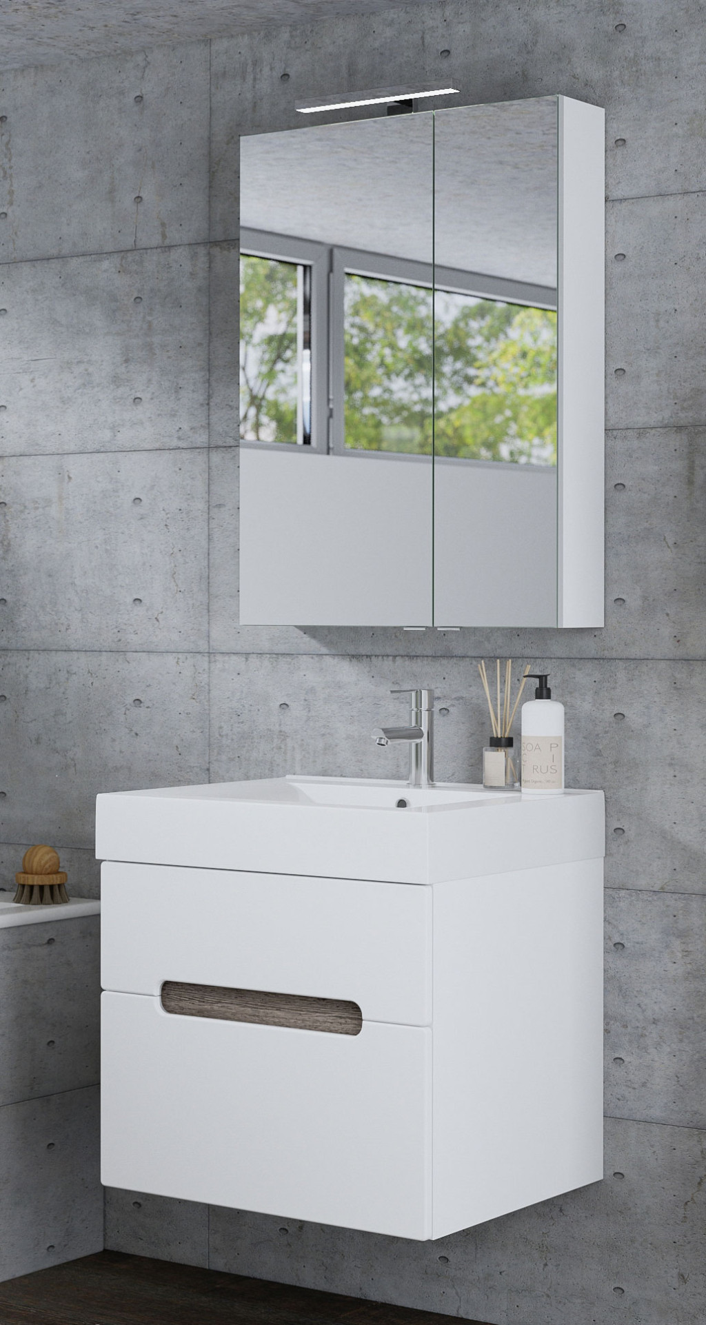 Az ár az alsó szekrényt mosdóval és a felső tükrös szekrényt tartalmazza.