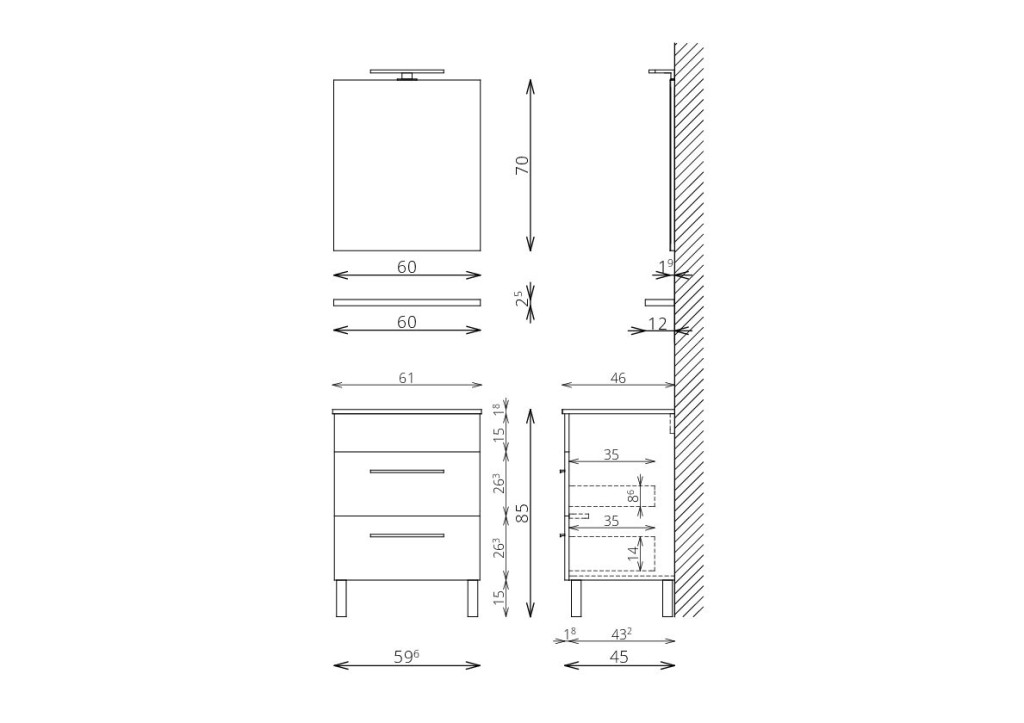 Az ár az alsó szekrényt mosdótállal és a tükröt tartalmazza.