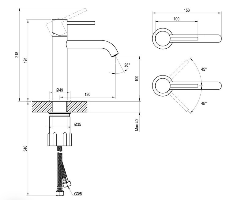 Csatlakozó tömlők: rugalmas 450 mm, átmérő DN6, G3/8