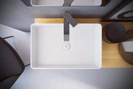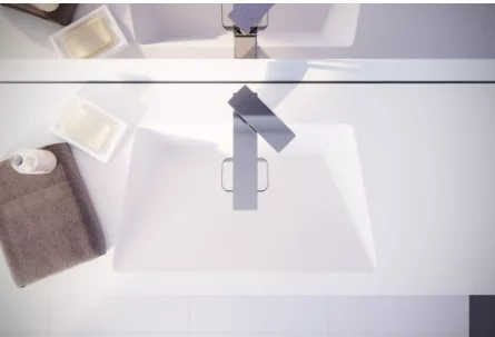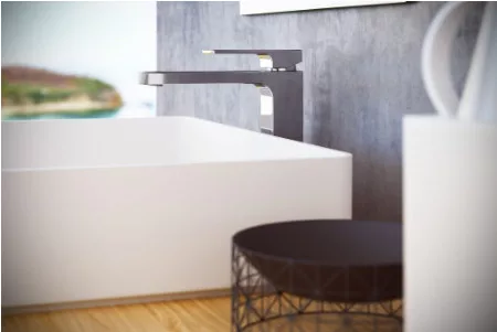 Króm színű mosdó csaptelep, amely a modern formákat tükrözi.