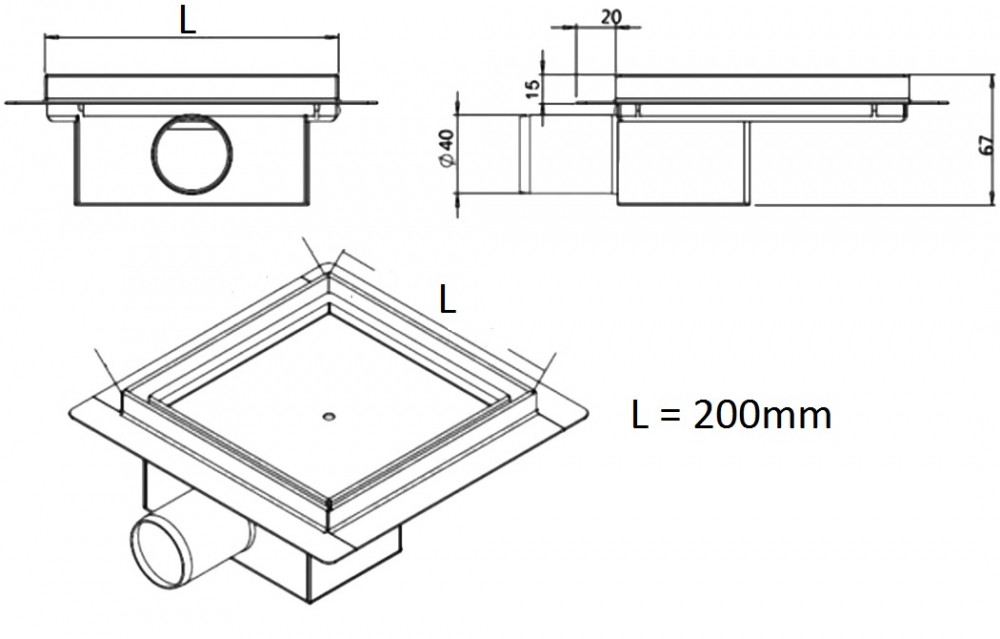 Padlóösszefolyó, Roltechnik RRF-S rozsdamentes, szögletes, burkolható zuhanyfolyóka 20x20