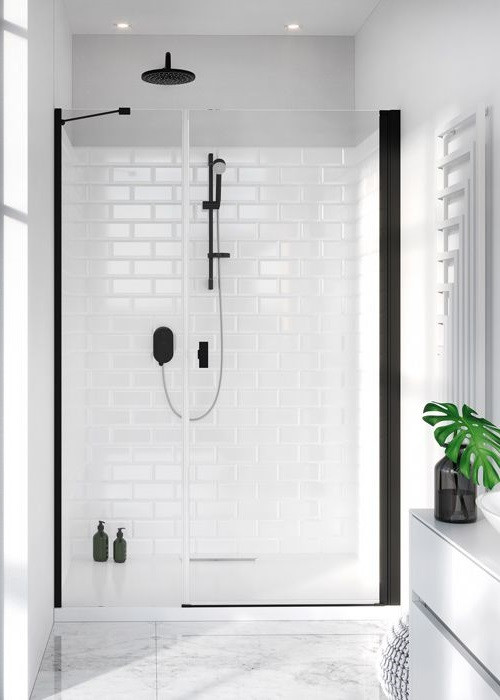Nes Black DWS I jobbos fekete lengőajtós kivitelű zuhanyajtó, fix üveg résszel, középre záró ajtóval