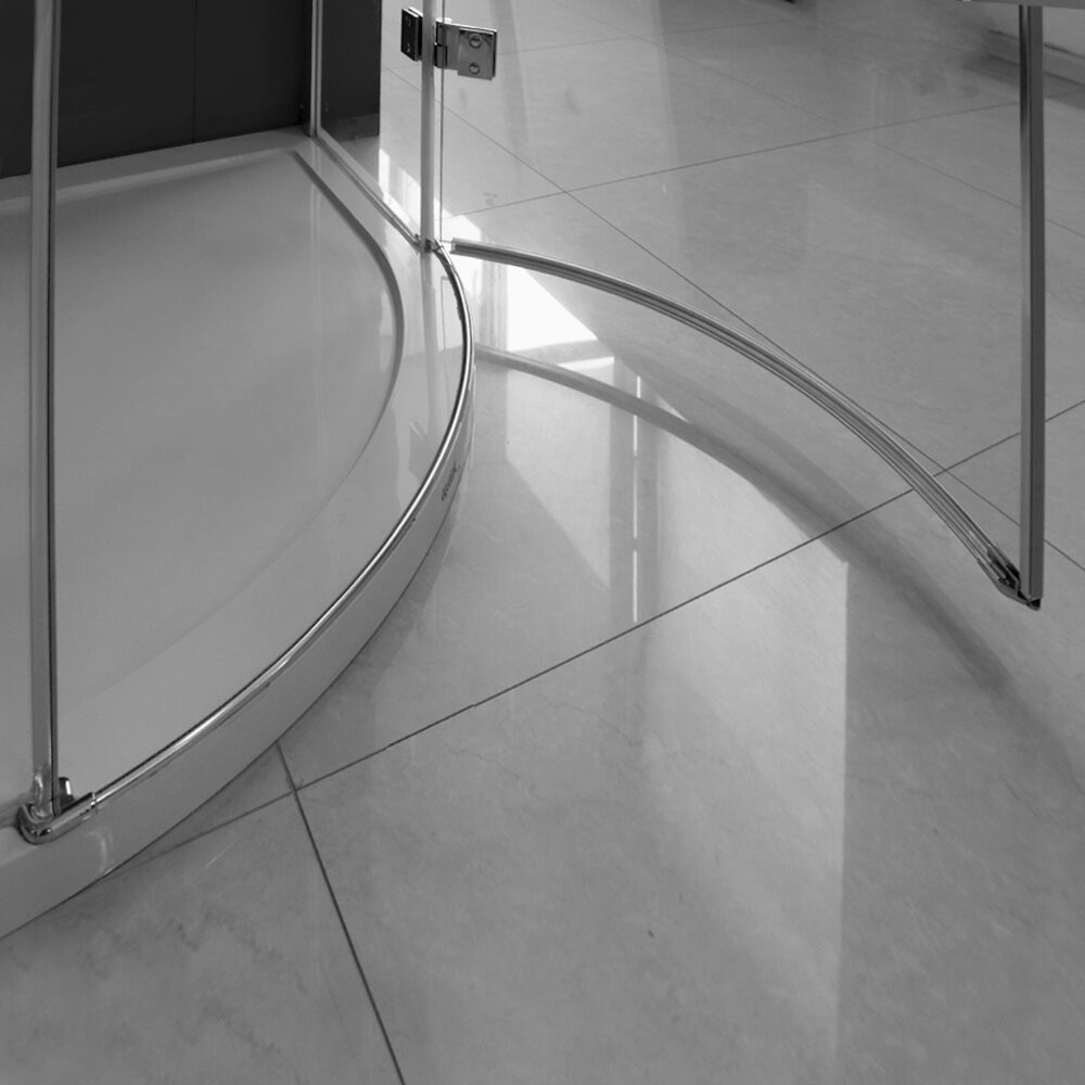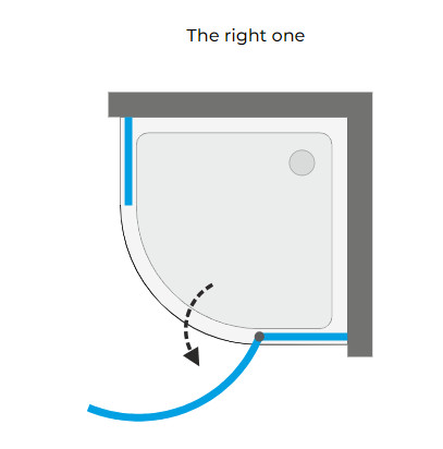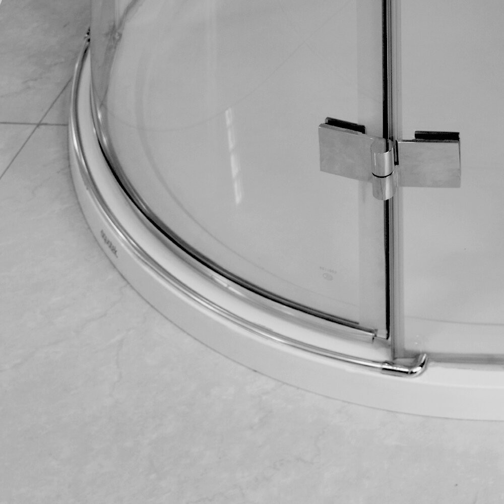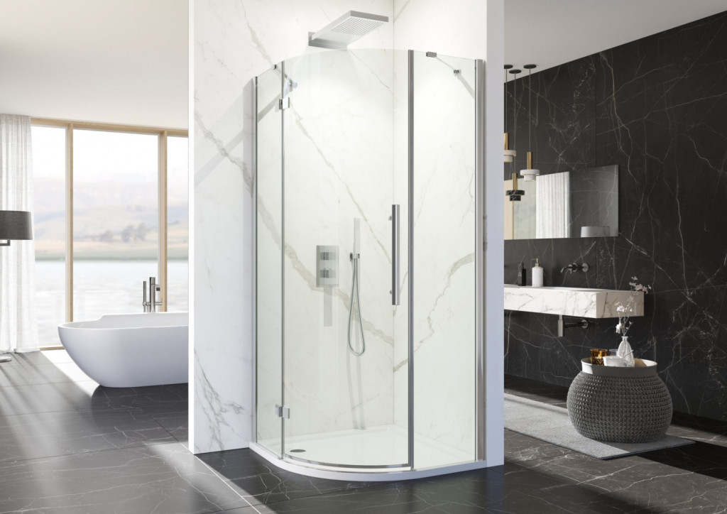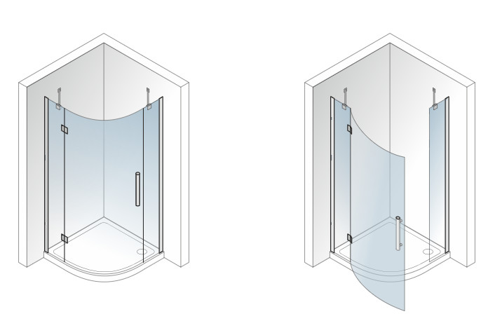 Íves zuhanykabin egy nyíló ajtóval (kifelé nyitható).