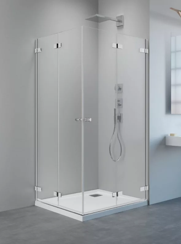 Szögletes, teljesen a falra hajtható dupla csuklós/lengőajtós zuhanykabin.