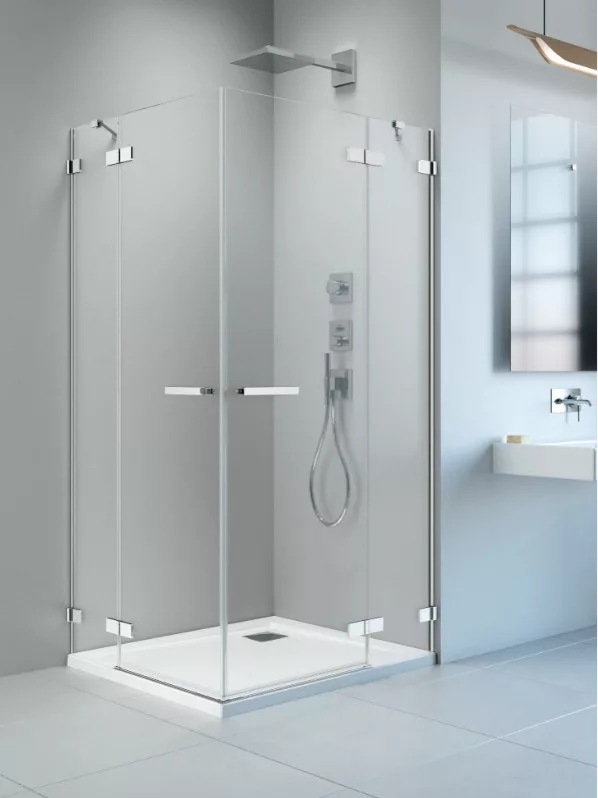 Kifelé-befelé nyíló szögletes zuhanykabin két nyílóajtóval, oldalanként fix résszel.