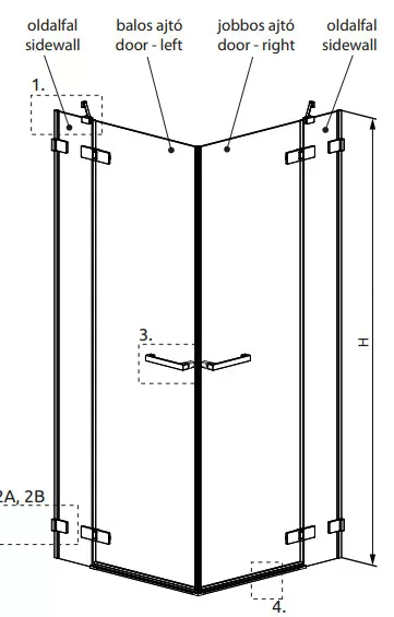 Kifelé-befelé nyíló szögletes zuhanykabin két nyílóajtóval, oldalanként fix résszel.