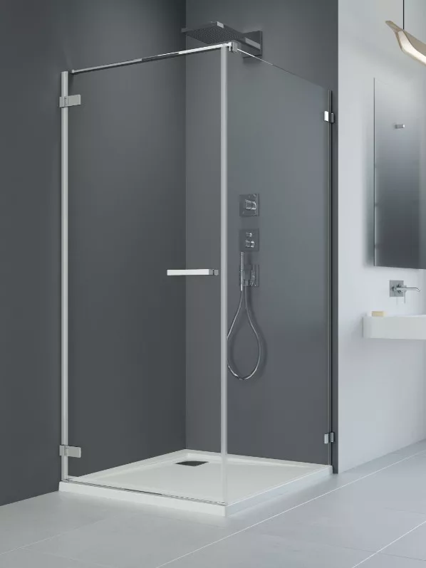 Kifelé-befelé nyíló szögletes zuhanykabin egy fix és egy nyíló oldallal.