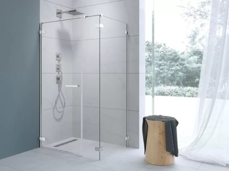 Kifelé-befelé nyíló szögletes zuhanykabin egy fix és egy nyíló oldallal.