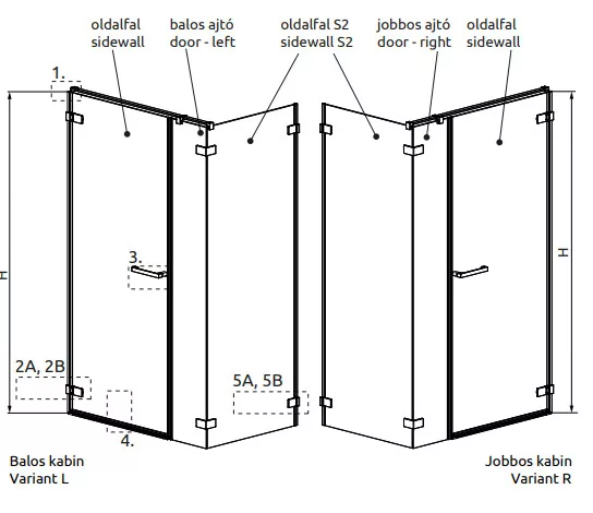 Kifelé-befelé nyíló szögletes zuhanykabin egy fix és egy nyíló oldallal.