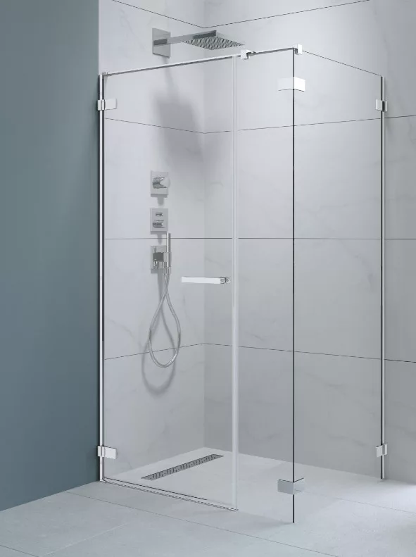 Kifelé-befelé nyíló szögletes zuhanykabin egy fix és egy nyíló oldallal.