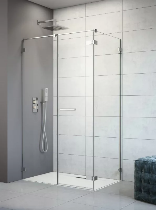 Kifelé-befelé nyíló szögletes zuhanykabin egy fix és egy nyíló oldallal.