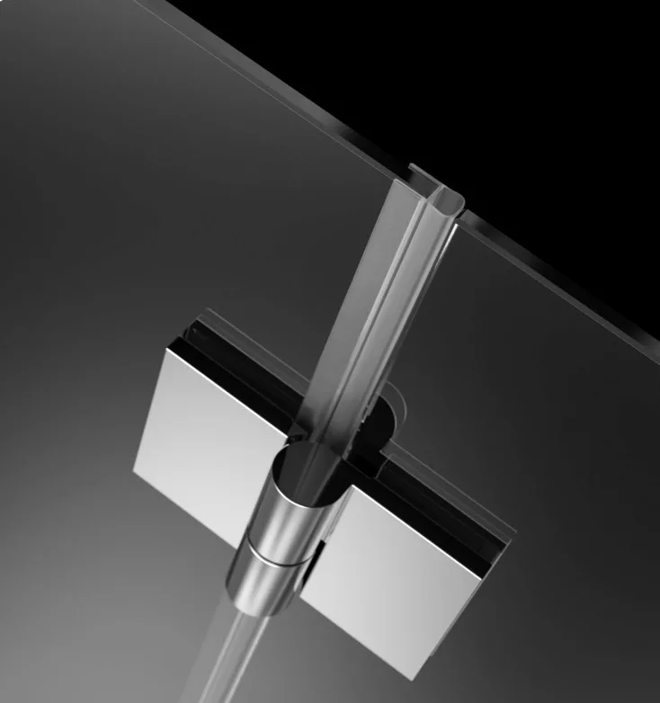 Különleges zuhanykabin, befelé nyíló ajtóval és egy fix oldallal.