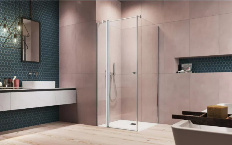 Kifelé-befelé nyíló szögletes zuhanykabin egy fix és egy nyíló oldallal.