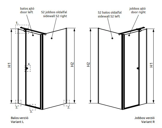 Kifelé-befelé nyíló szögletes zuhanykabin egy fix és egy nyíló oldallal.