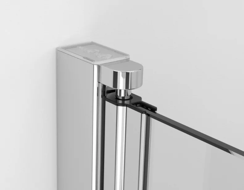 Íves zuhanykabin kifelé-befelé nyíló dupla lengőajtóval, a falnál fix részekkel.
