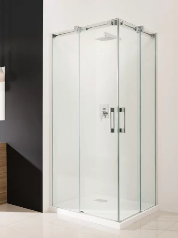 Szögletes felsőgörgős zuhanykabin dupla tolóajtóval.