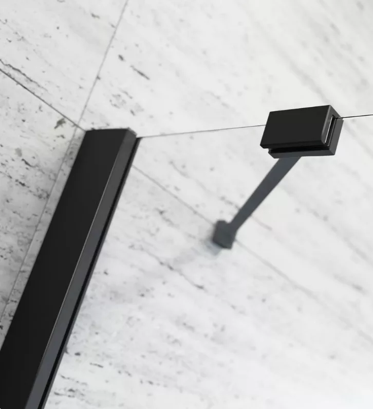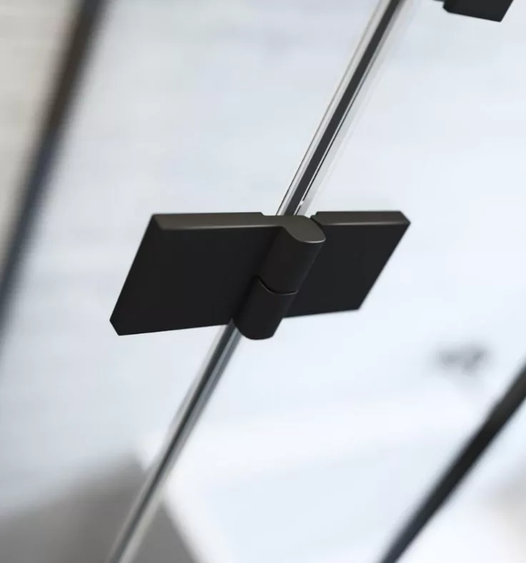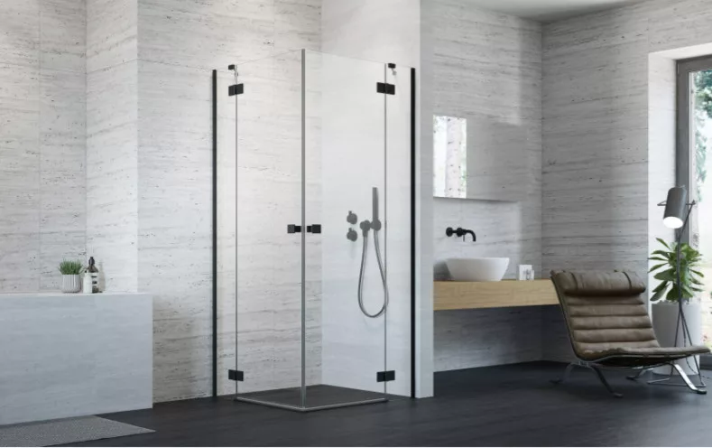 Szögletes fekete zuhanykabin két fix résszel, kifelé nyíló ajtóval.