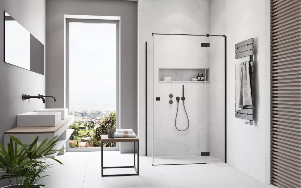 Szögletes fekete zuhanykabin kifelé nyíló ajtóval és egy fix oldalfallal.