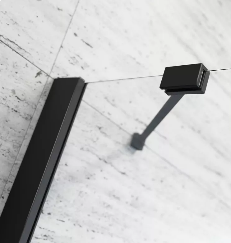 Egyenes falra építhető, háromoldalú kifelé nyíló fekete szögletes zuhanykabin két fix és egy nyíló oldallal.
