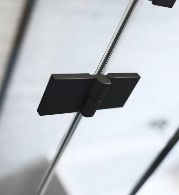Egyenes falra építhető, háromoldalú kifelé nyíló fekete szögletes zuhanykabin két fix és egy nyíló oldallal.