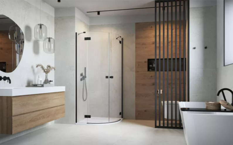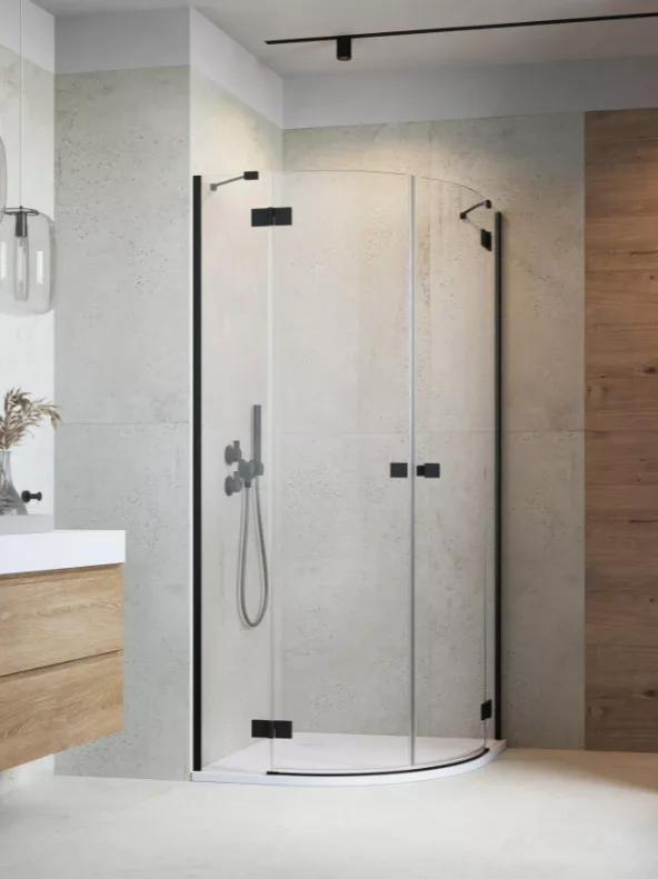 Íves zuhanykabin kifelé nyíló ajtókkal, oldalanként fix résszel.